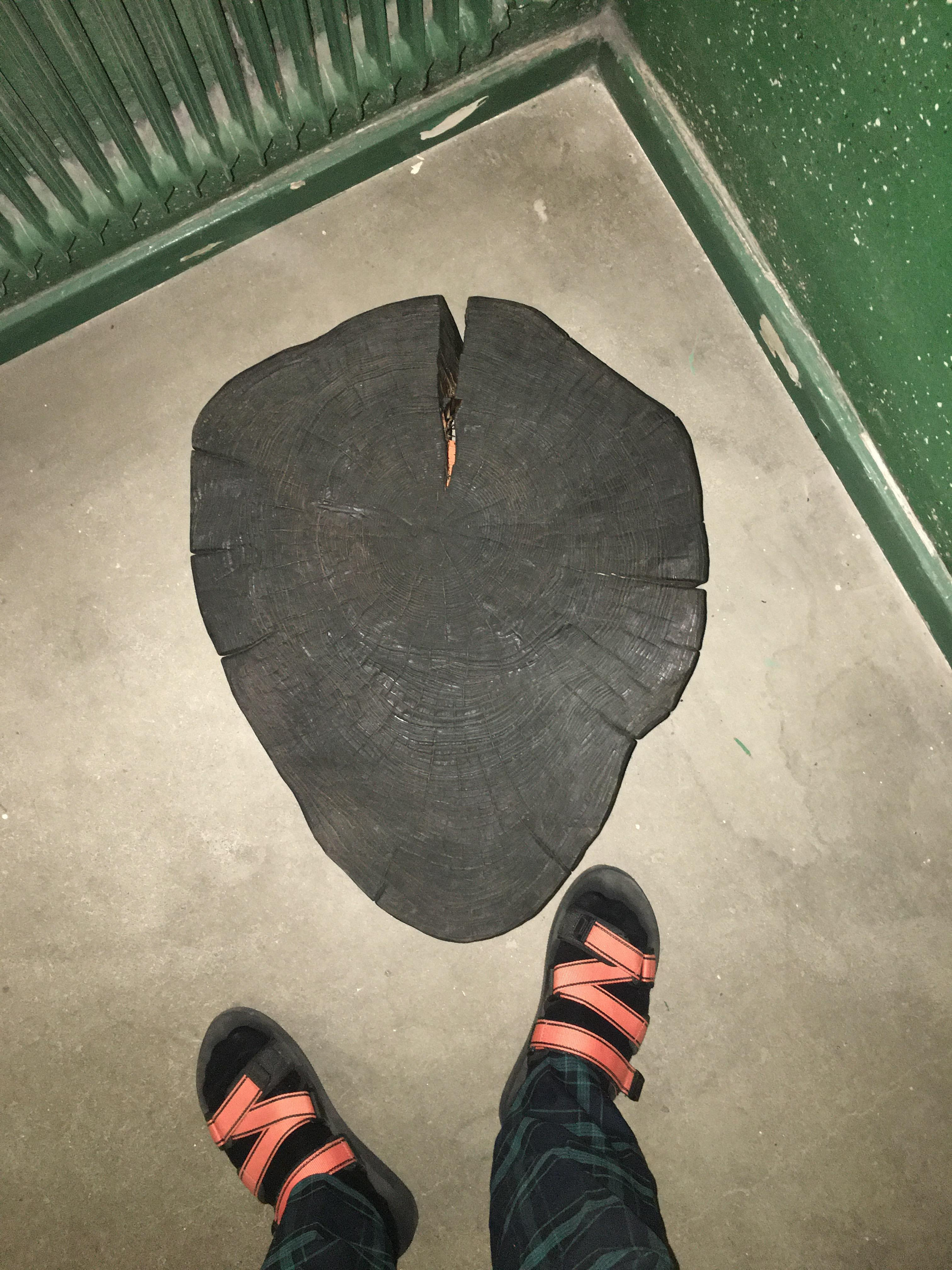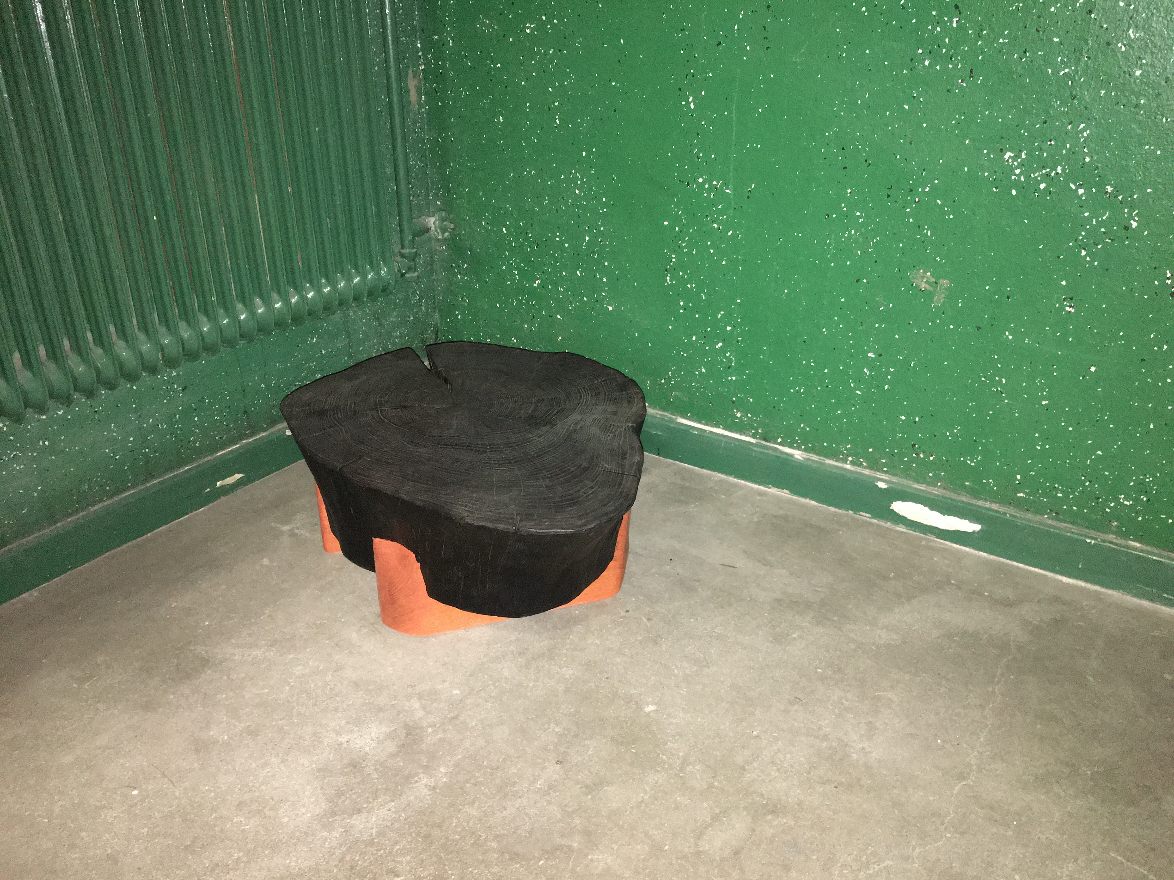A 130 year old pine tree was taken down outside the studio one day. A piece of the tree was left on the stump. I couldn't leave it there. When I looked at it I saw a bowl or a small table. I took away the bark and began to form it and chop away wood for the oak legs. Since it's a fresh piece of wood and the oak legs aren't it continued to shrink around the legs and pressing it together. Because of that I didn't have to use any glue for this piece. The oak is orange dyed and the pine is treated with the shou sugi ban technique.